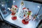 One figure is depicted in a cheerful waving pose, wearing a red Christmas dress with white trim, conveying warmth and celebration.