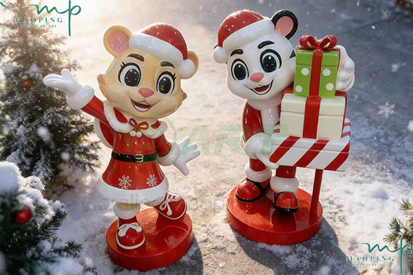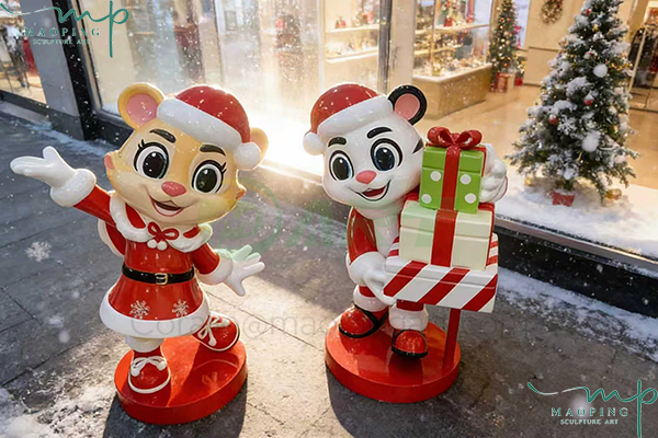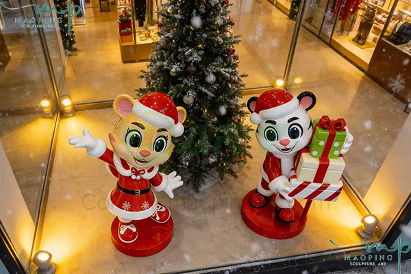 This sculpture set is a customizable fiberglass Christmas-themed cartoon animal artwork, designed to create a joyful and welcoming festive atmosphere. The figures are presented as cute anthropomorphic animals dressed in Santa-style outfits, combining holiday symbolism with playful character design.