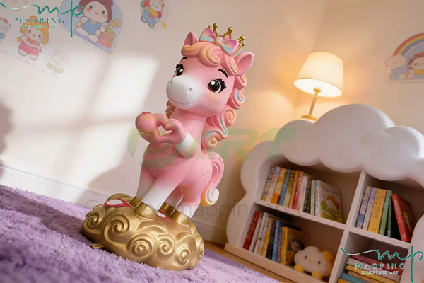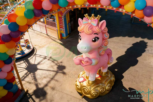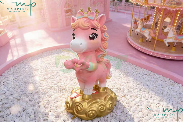 This sculpture is a custom-made fiberglass unicorn cartoon sculpture, designed with a soft, dreamy aesthetic and strong visual appeal. The figure features a standing unicorn princess pose, symbolizing innocence, fantasy, and joy—perfect for creating an eye-catching focal point in decorative environments.
