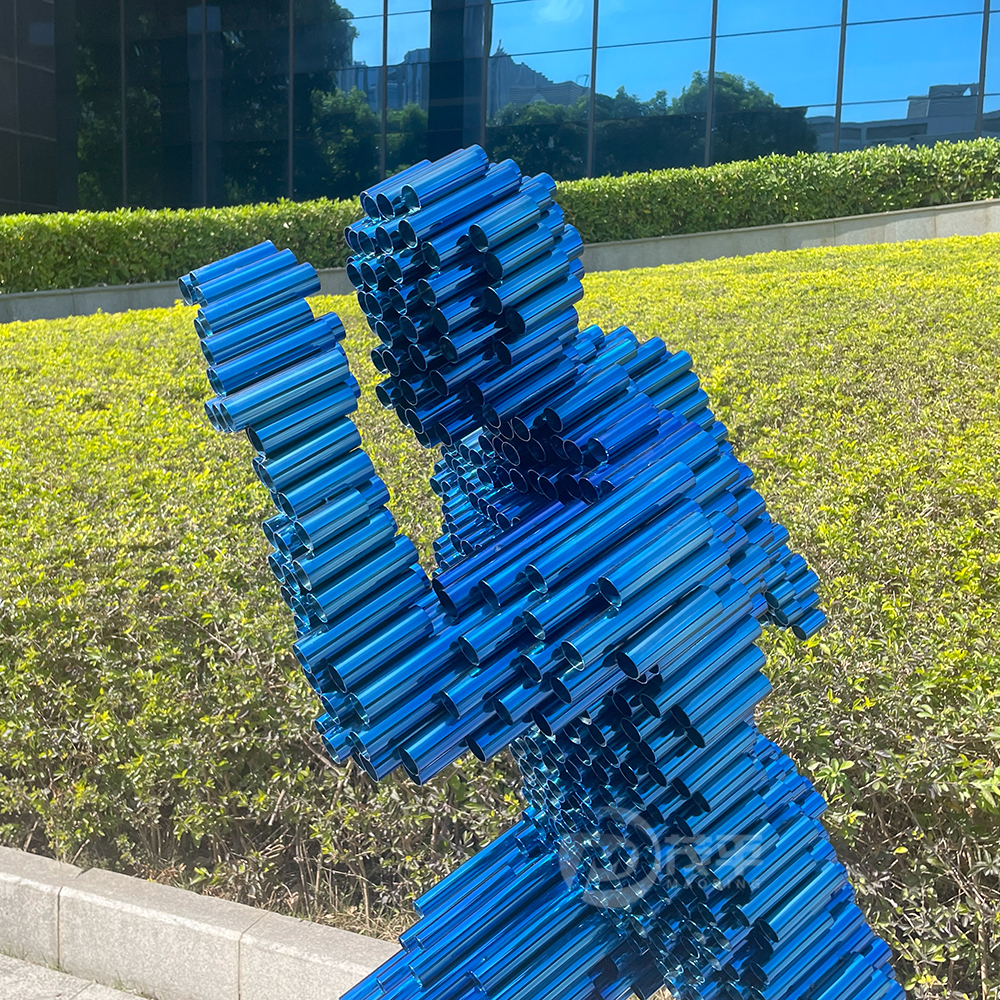 Each pipe is carefully bent and joined, contributing to the overall silhouette of the figure. The pipes vary in diameter, with thicker ones forming the base and legs for stability, and thinner ones used for the arms and head, adding a sense of lightness and speed. The blue color of the pipes is vibrant, giving the sculpture a striking appearance that contrasts beautifully against its surroundings, whether placed in an urban park or an art gallery. running man sculpture