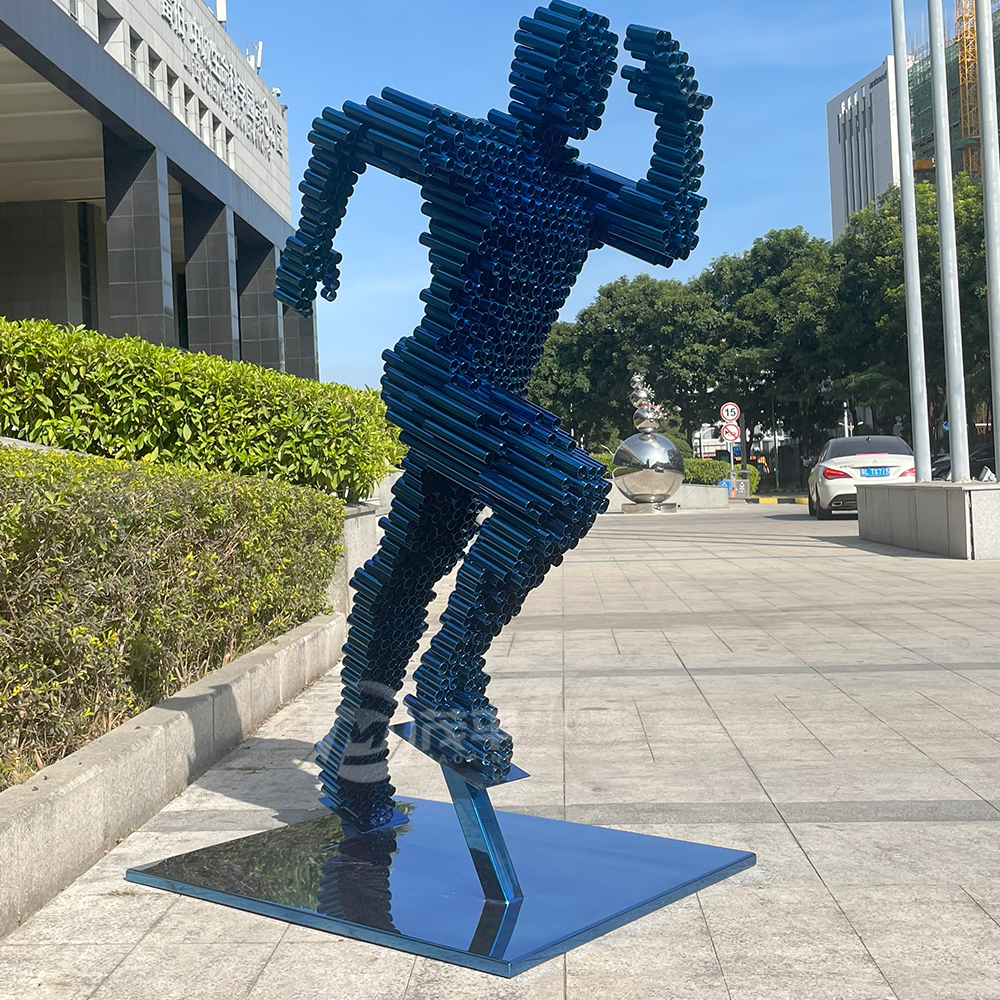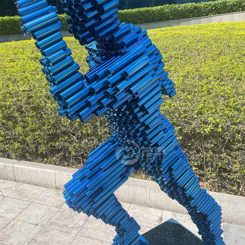 The sculpture of a running man is an intriguing piece of modern art. It is composed entirely of blue steel pipes, skillfully welded together to create the dynamic form of a human in motion. The structure stands tall, capturing the fluidity and energy of a person running. running man sculpture