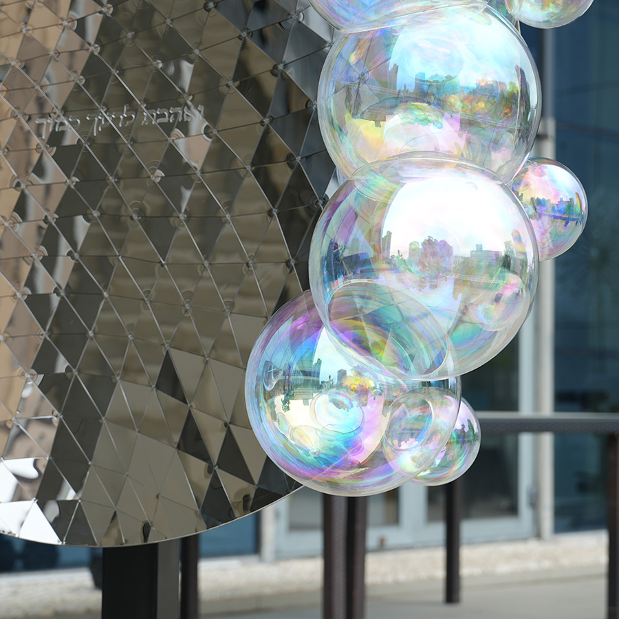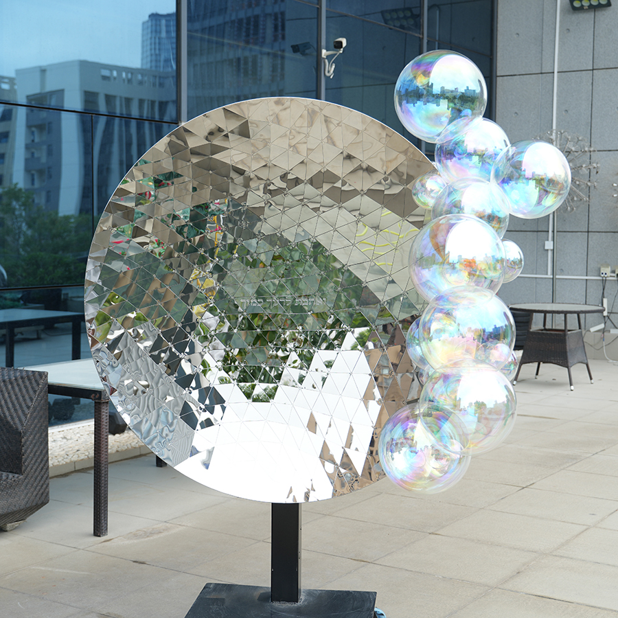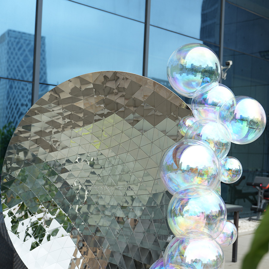 The sculpture is composed of handcrafted triangular stainless steel panels, carefully welded and polished by master artisans. The integrated crystal-like bubble elements introduce a soft contrast to the strong metallic geometry, forming a balance between hardness and transparency.