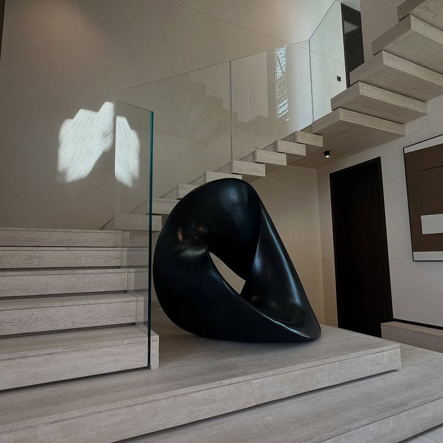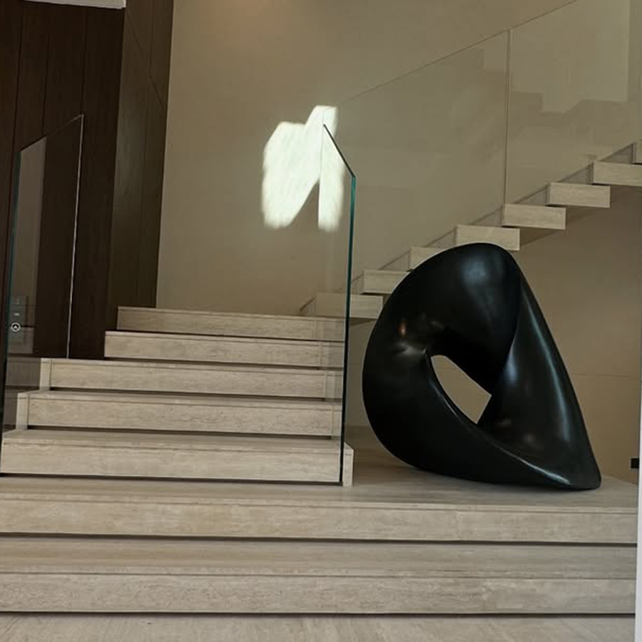 Premium Material & Finish: Crafted from high-grade stainless steel, the piece is finished with a specialized matte black coating. Unlike mirror-polished steel, this satin finish absorbs light, emphasizing the sculpture’s silhouette and creating a powerful contrast against light-colored stone or marble interiors.