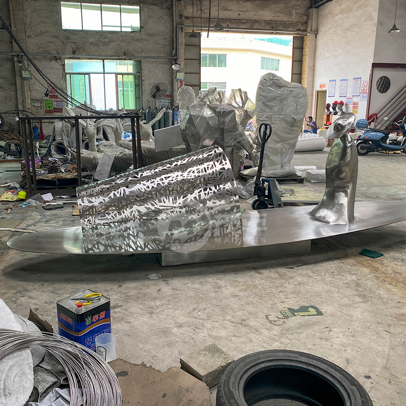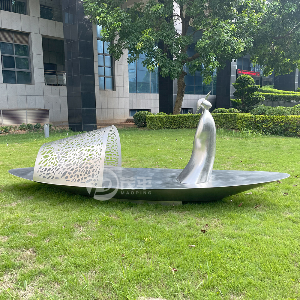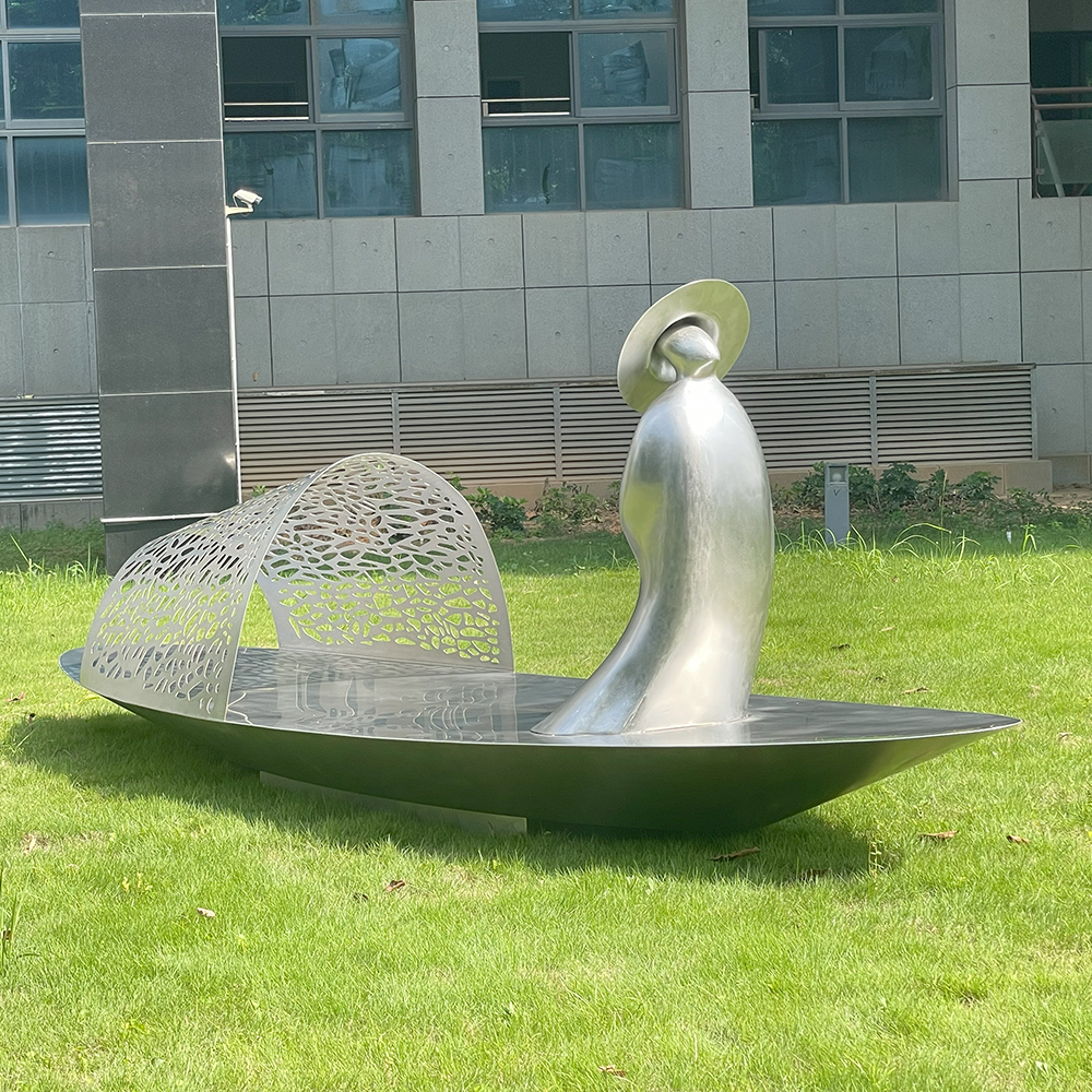 Discover a stunning stainless steel landscape sculpture featuring an abstract figure in a traditional hat seated on a polished boat with a laser-cut canopy. Perfect for parks, lakesides, gardens, resorts, and cultural destinations. Weather-resistant 304/316 stainless steel. Custom sizes and finishes available.