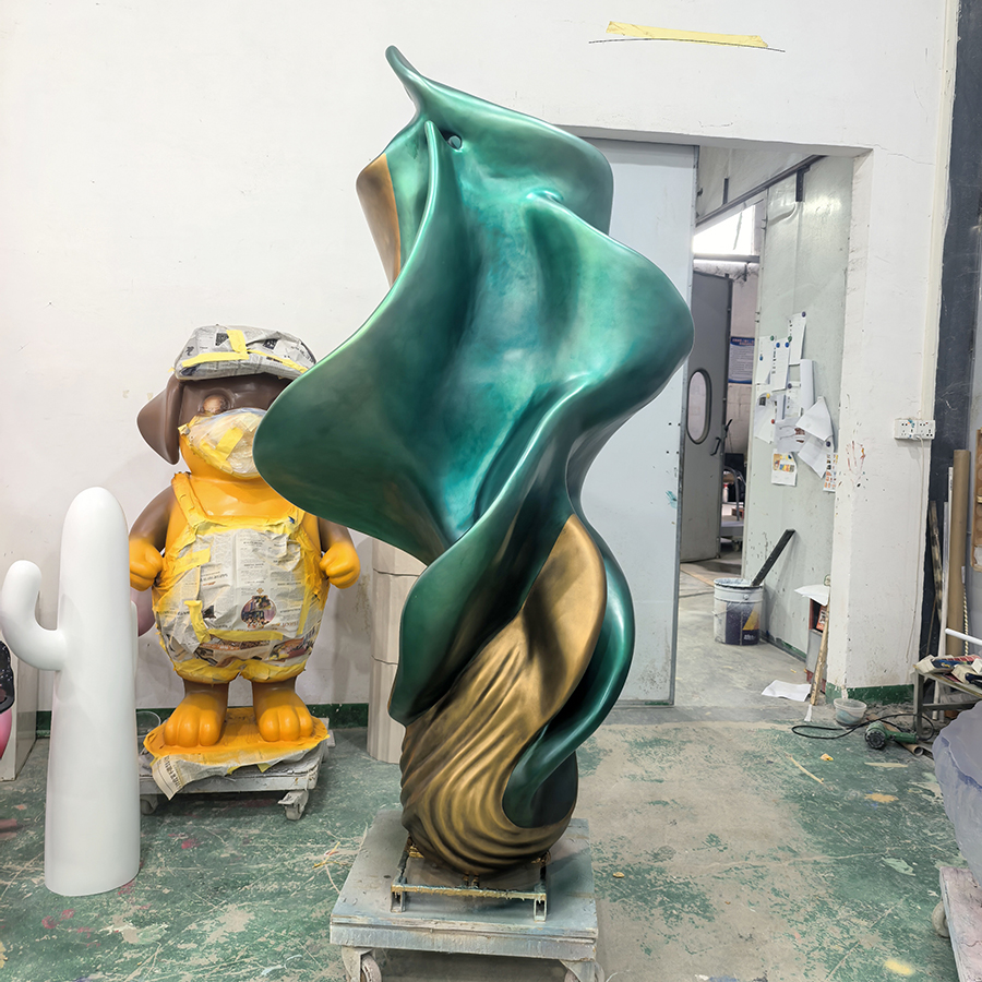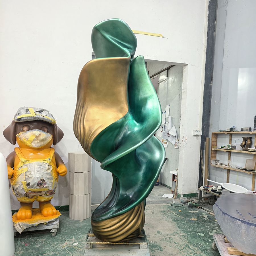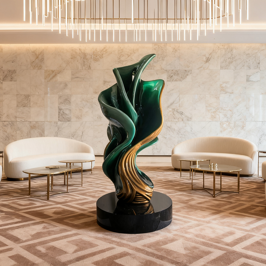 This fiberglass abstract sculpture is a captivating interior art piece designed to bring modern elegance and artistic energy into any space. Featuring a dynamic flow of green and gold tones, the sculpture resembles organic, wave-like forms rising gracefully from its circular black base. Its glossy surface and fluid curves create a sense of movement, making it a striking focal point for hotel lobbies, luxury residences, shopping malls, and corporate spaces.