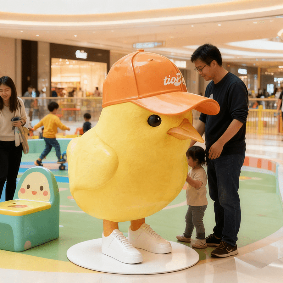 This fiberglass chick sculpture features a cute design with a bright yellow body, orange cap, and white sneakers. Ideal for cafés, malls, and outdoor spaces, it’s made of durable FRP and hand-painted for lasting color and shine.