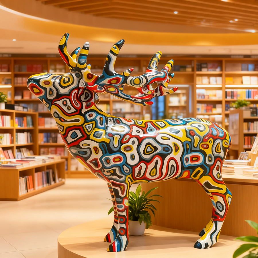 This colorful fiberglass deer sculpture features a hand-painted geometric design that adds modern artistic flair to interiors. Perfect for shopping malls, hotels, and bookstores, it’s a vibrant statement piece that combines creativity and craftsmanship.