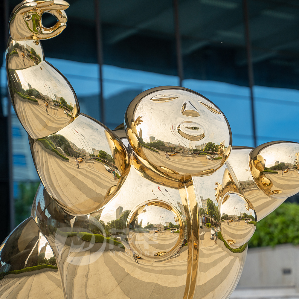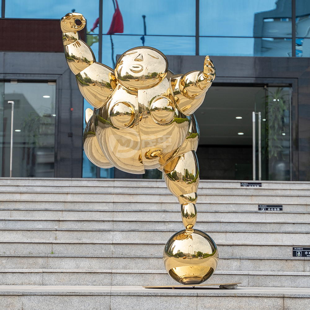 The sculpture portrays a portly man striking a whimsical pose atop a ball, adding an element of humor and balance. The man, depicted with exaggerated corpulence, stands confidently on the sphere, creating a contrast between his bulky form and the delicate balance required to maintain his position. The artist has skillfully rendered the folds of the man’s skin and clothing, emphasizing his size. Despite the playful nature of the subject, the sculpture exhibits a high level of craftsmanship, with attention to detail in the man’s facial expression and posture. The ball, smooth and simple, serves as a minimalist base that further accentuates the man’s girth. The piece, perhaps made of bronze or stone, is a blend of realism and caricature, challenging the viewer’s perceptions of balance, weight, and artistry.figure statue