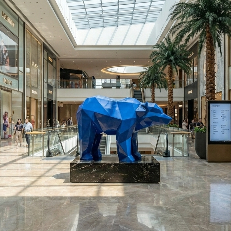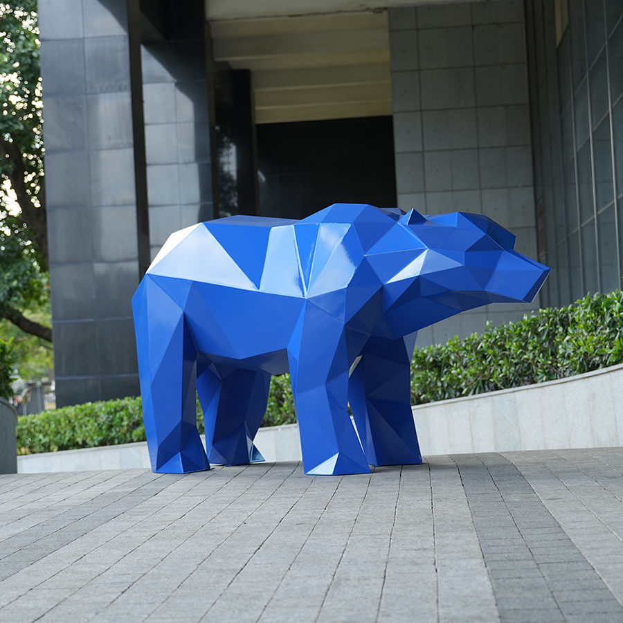 Finished in a deep metallic blue coating, the stainless steel surface reflects ambient light and surrounding city views, creating a dynamic visual effect that changes throughout the day. The angular geometry emphasizes strength, stability, and confidence—making the bear a symbolic centerpiece for modern interiors.