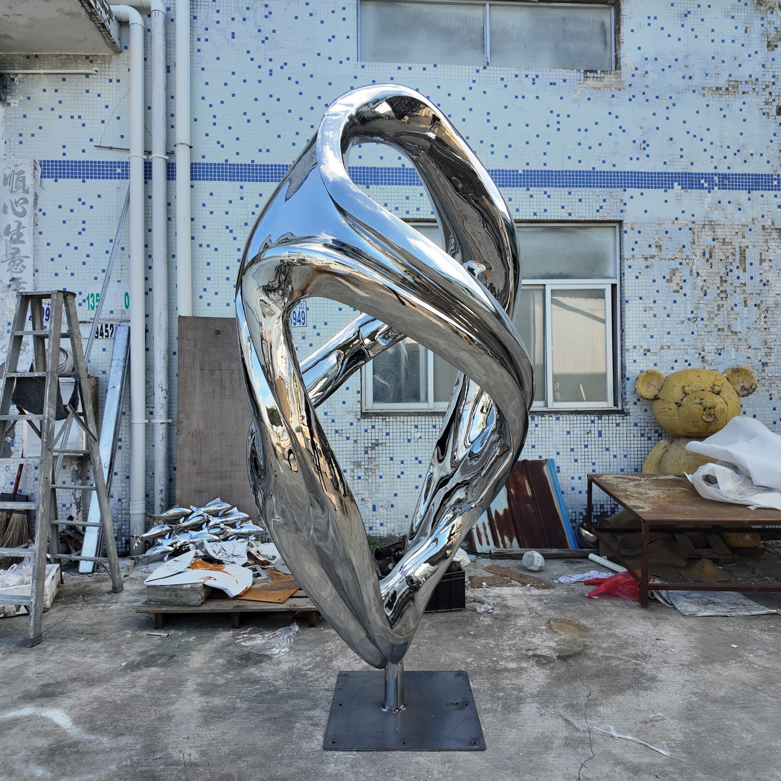 This large-scale stainless steel abstract sculpture is designed as a striking centerpiece for luxury hotel lobbies, grand atriums, and high-end commercial interiors. Featuring a flowing, intertwined form, the sculpture expresses movement, balance, and modern elegance, making it ideal for spaces that demand both visual impact and refined artistry.