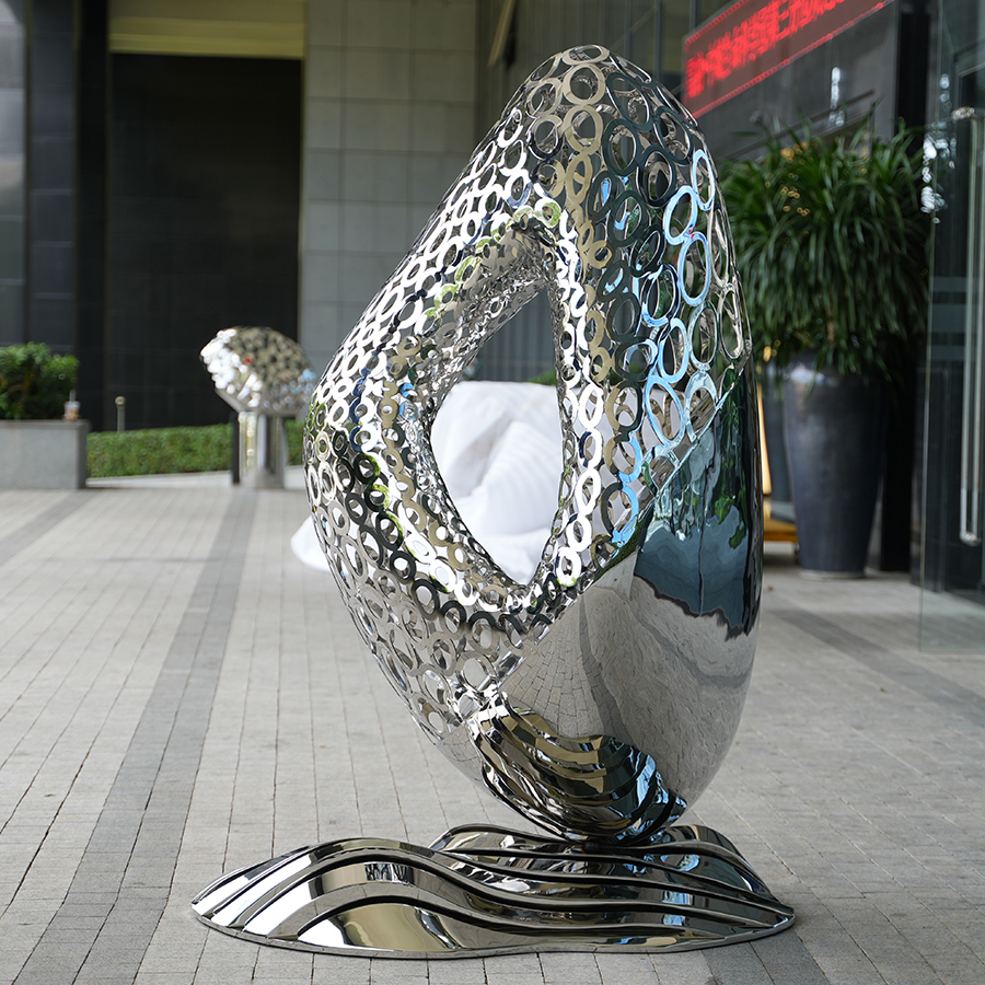 Surface Finish: Fabricated from high-grade 304 or 316 Stainless Steel with a Super Mirror Polished finish. This highly reflective surface allows the sculpture to blend seamlessly into its environment, reflecting changes in weather, traffic, and lighting throughout the day.