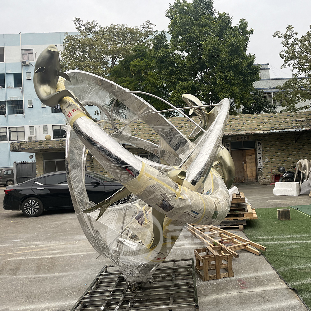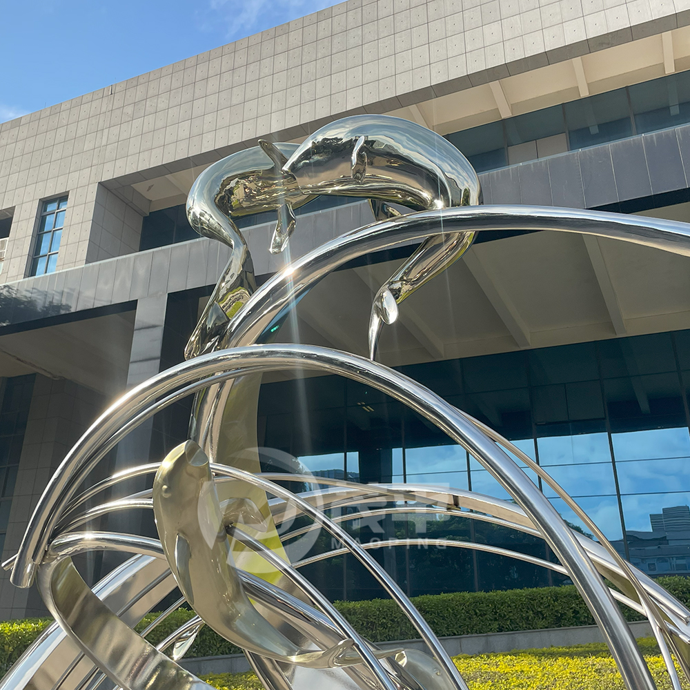 | The sculpture, designed in high-grade stainless steel, boasts a brilliant shine that captures the essence of a fish in mid-leap. It reflects the sunlight during the day, creating a dazzling display of light and shadow, and transforms into a silvery beacon under the moonlight, adding an ethereal touch to the evening ambiance. | ![]() |