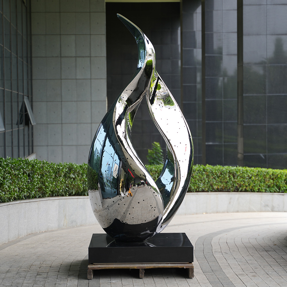 Elevate your outdoor space with this mirror-polished stainless steel sculpture. Flame-inspired abstract design ideal for commercial, public, and modern architectural environments.