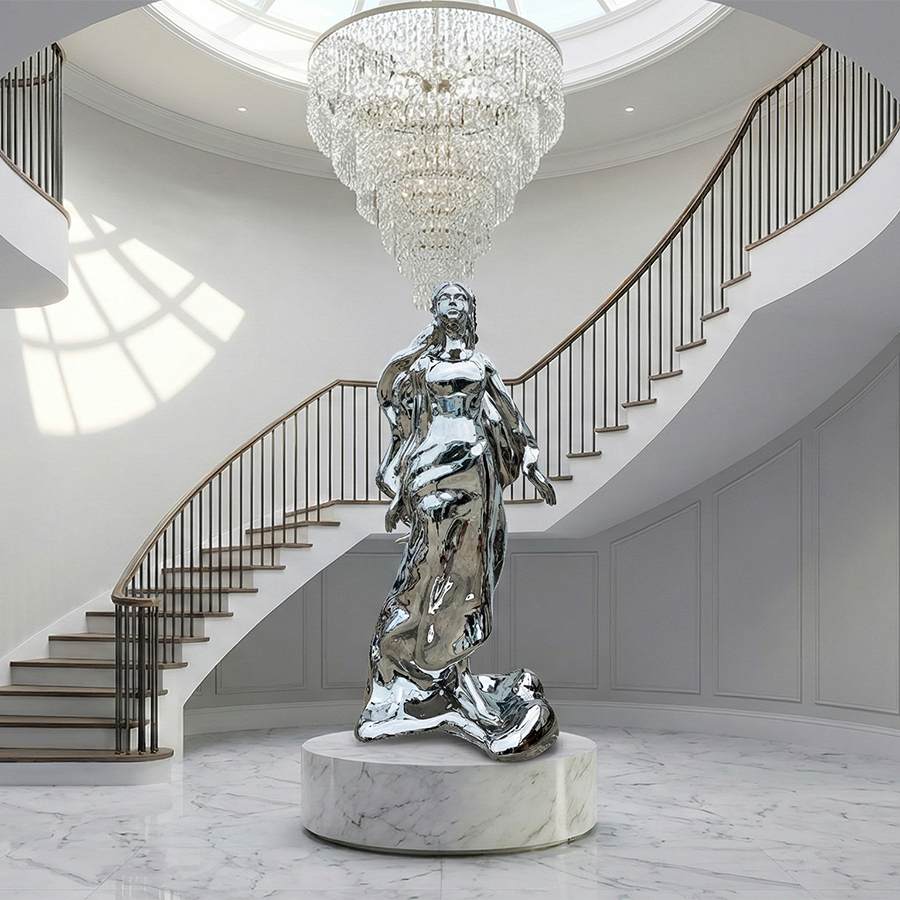 This contemporary stainless steel sculpture presents an elegant female figure rendered in a fluid, organic form. Crafted in mirror-polished stainless steel, the surface captures and reflects its surrounding architecture, lighting, and movement, allowing the sculpture to visually interact with the space around it.