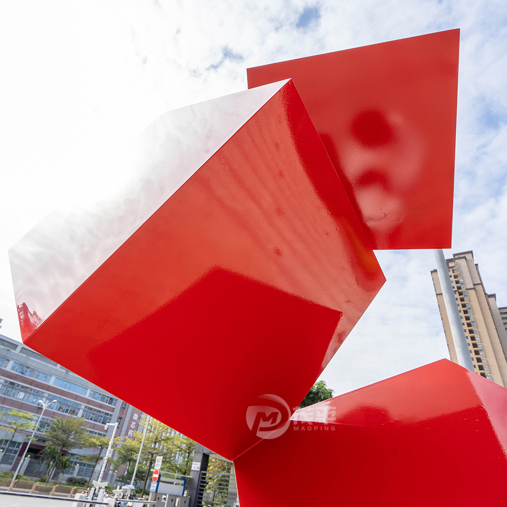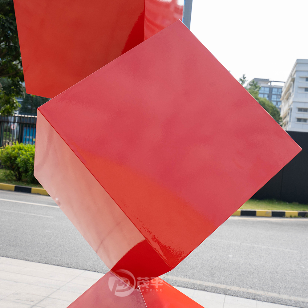 Crafted from high-quality 304 stainless steel, the structure is welded, polished, and coated with durable automotive-grade red paint to ensure long-lasting brilliance and weather resistance. The cubic elements are arranged in an upward spiral, representing growth, progress, and balance amid motion — a popular theme for corporate and public art installations.