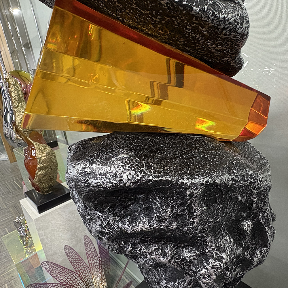 Elevate your interior space with this striking modern resin sculpture, featuring a dynamic interplay of organic stone textures and a glowing amber resin element. The design captures the essence of nature with two rugged rock-like forms expertly crafted in realistic dark stone texture, elegantly balanced around a translucent amber bar. The central amber piece adds a bold contrast—symbolizing energy, light, and motion.