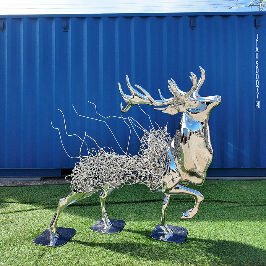Crafted from premium 304 / 316 stainless steel, the surface is meticulously hand-polished to a mirror finish, reflecting surrounding light, greenery, and architecture. The sculptural antlers rise elegantly, symbolizing strength, vitality, and harmony with nature, while the dynamic posture brings a sense of motion and life into the space.