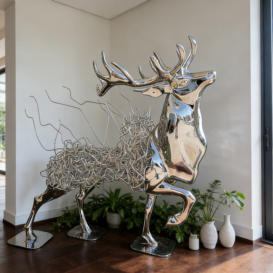 Modern stainless steel deer sculpture with mirror-polished finish and wire-mesh body. Ideal for luxury interior decor, hotel lobbies, villas, and commercial spaces. Custom sizes available.