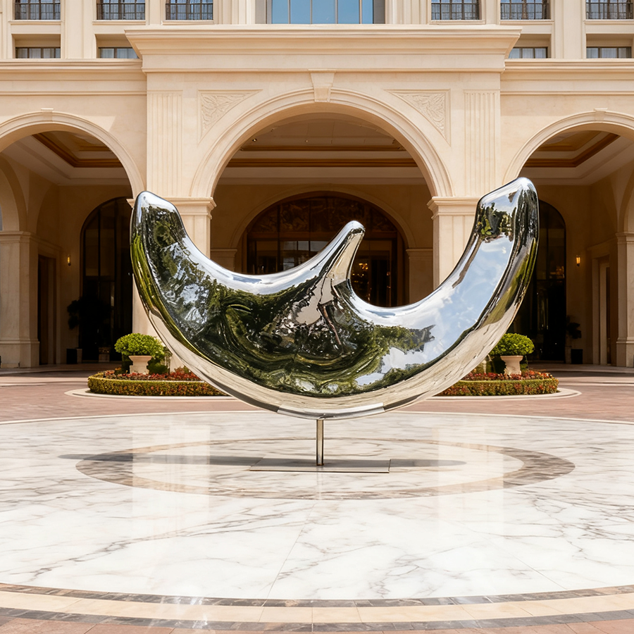 Its high-polish mirror finish reflects the surrounding gardens, sky, and architecture, allowing the sculpture to visually shift with the environment—like the changing phases of the moon. The elegant crescent form creates a peaceful focal point, making it perfect for urban plazas, office complexes, hotel courtyards, residential parks, and cultural spaces.