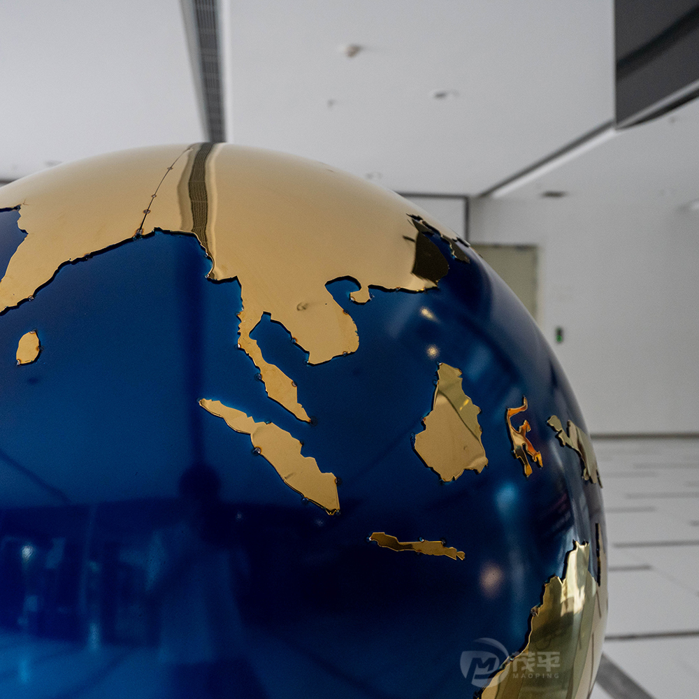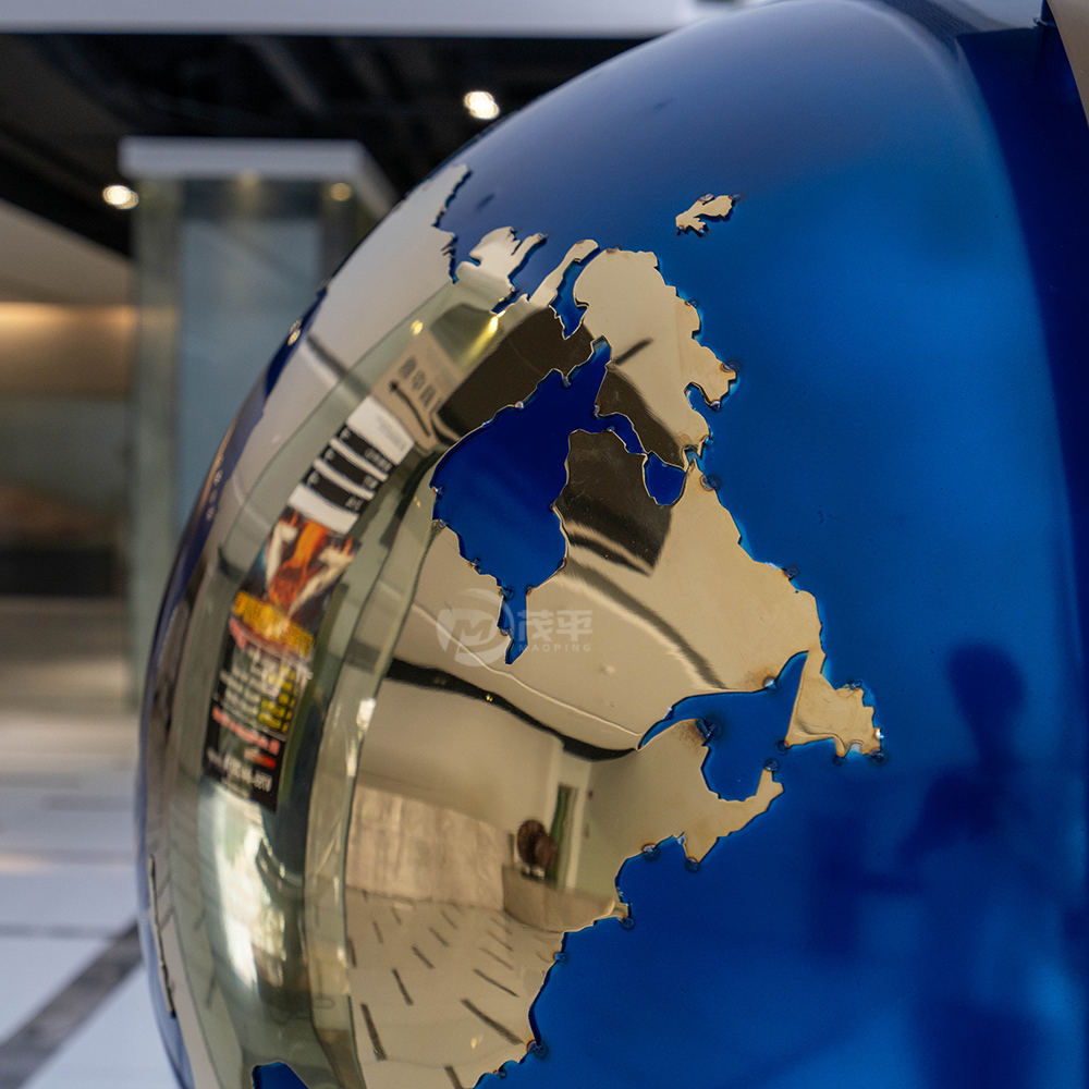 From afar, the sculpture appears as a resplendent sphere shimmering with vibrant hues, but upon closer examination, its intricate details emerge. The globe is structured with painstaking accuracy, with every continent and major geographical feature accurately portrayes. The oceans, rather than being rendered in traditional blue, are polished to mirror-like sheen, thier reflective surface subtly mirroring the colors of the surrounding environment and the sky overhead.