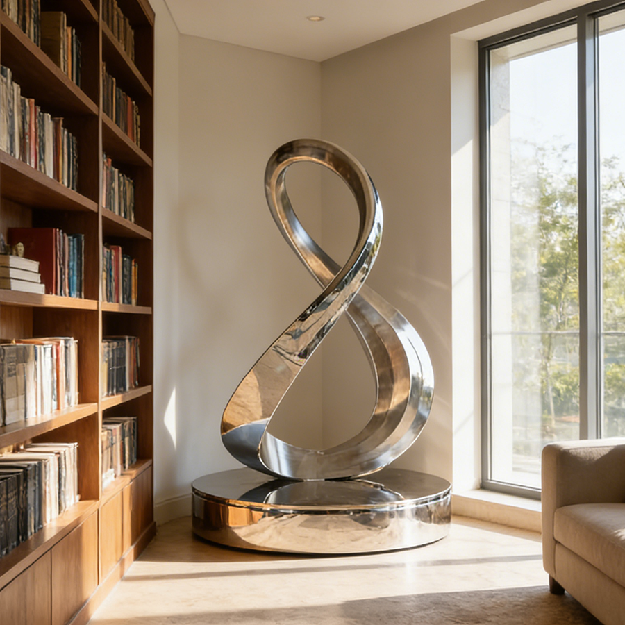 Elevate your space with this mesmerizing Mirror Polished Stainless Steel Infinity Sculpture. Featuring a silent rotating base and marine-grade durability, it is the perfect kinetic centerpiece for luxury yachts and hotel lobbies.