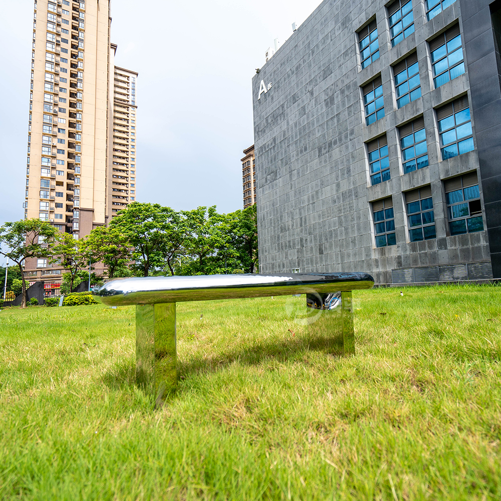 One of the most striking feature of bench is its polished stainless steel surface. The steel has been brushed and polished to mirror-like sheen, relecting the surrounding greenery and sky, subtly blending into the park’s landscape. The material is resillient and durable, designed to withstand the rigors of outdoor use without compromising on sethetics.
