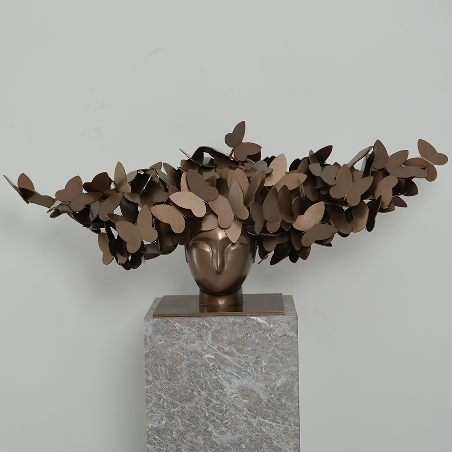 Explore ‘Metamorphosis,’ a stunning stainless steel bust where thoughts turn into butterflies. Antique bronze finish. A perfect surrealist statement piece for luxury interiors.