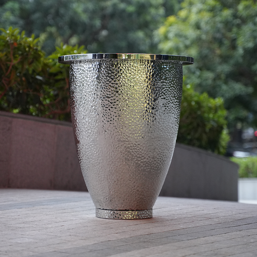 Luxury hammered stainless steel planter for hotel lobbies, commercial landscapes, and modern architecture. Durable, corrosion-resistant, and customizable.