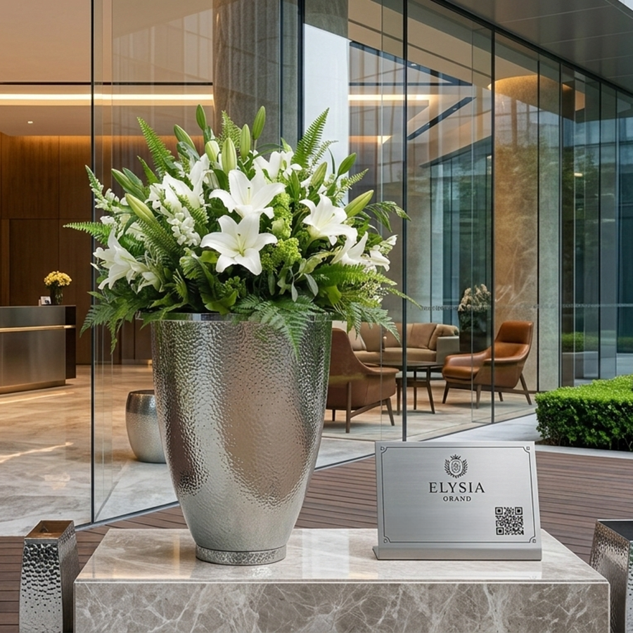 The planter’s minimalist yet luxurious design makes it ideal for hotel entrances, office lobbies, residential courtyards, commercial plazas, and luxury developments. When paired with floral arrangements or ornamental plants, it becomes a striking focal point that enhances the overall spatial atmosphere.