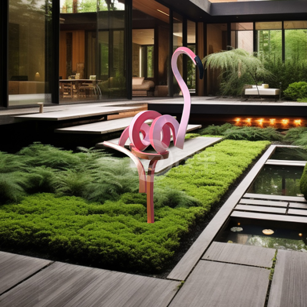 A stainless steel twisted flamingo sculpture is a contemporary art piece that combines the elegance of a flamingo with the sleek.