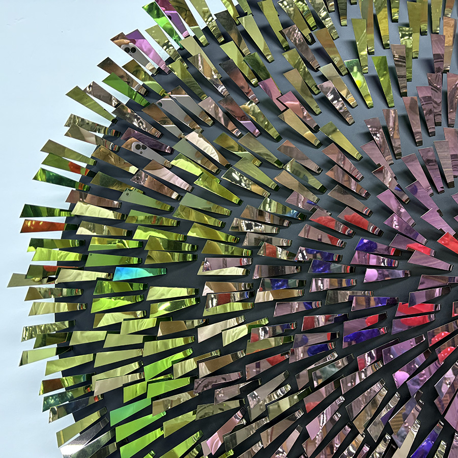 This stainless steel wall artwork is a mesmerizing explosion of color and light — a perfect statement piece for modern interior design. Measuring 125 cm in diameter, the circular sculpture is composed of hundreds of meticulously hand-crafted metal strips that radiate outward from the center, forming a dynamic, sunburst-like composition.
